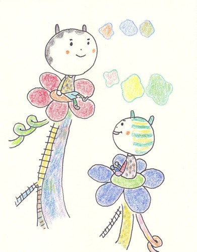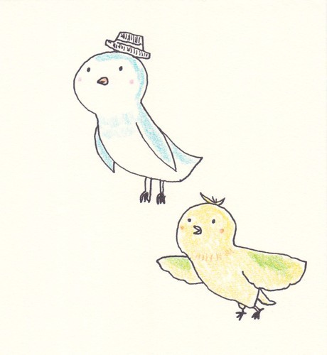 Sat.11.09.2013 マジック・ショー また手品を見る機会があり、途中からでしたが見てきました。 下のイラストは、マジック・ショーに出演した、 ピーちゃん(青)とパーちゃん(黄)という小鳥と、 真っ白なハトです。 ハトは手に乗せさせてもらえました。 目が赤くて、温かかったです。