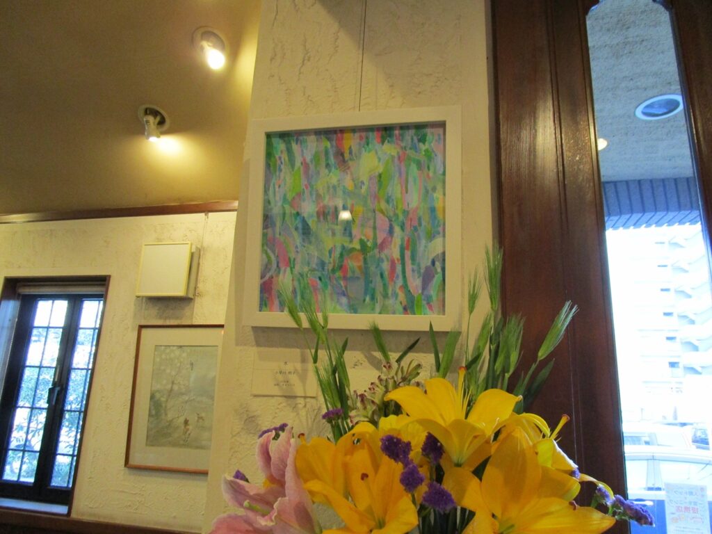 Tue.04.07.2026 茶房 万葉人さん展示替え 一宮駅西側にある喫茶店、茶房 万葉人さんに展示させていただいている油彩画を、春夏向けのものに替えてきました。個展のDMを置かせていただき、ポスターも貼ってくださるそうです。ありがとうございます。 「水」 個展のポスター