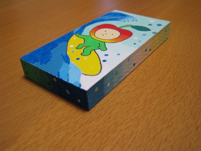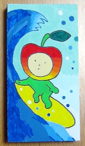 Sat.04.05.2014 りんごサーファー 今年も、アートクラブから、「全国かまぼこ板の絵展覧会」に 応募する時期がやってきました。 昨年応募した「りんごちゃん」を描いたかまぼこ板は、 愛媛県のギャラリーから戻ってきました。 私は、南西方面は、大阪までしか行ったことがないので、 りんごちゃんの方が、遠いところに旅をしたことになります。 今年は、りんごサーファーを描きました。 久しぶりにアクリルガッシュを使いました。 板の側面にも色を塗ったので、「箱」感がありますね。
