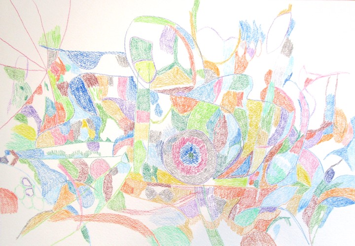 アトリエ・ブルートで、色鉛筆画を描いてきました。今回は結構大きな生成の紙です。大きな紙を前にすると、この細い色鉛筆で何が描けるだろうか、と未知の世界に飛び込む感じです。