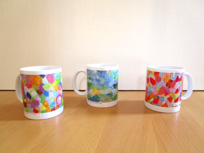 Sat.01.16.2021 マグカップ (株)アバンセライフサポートさんからお仕事をいただきました。周年記念のマグカップに私の油彩画を採用してくださいました。マグカップは、アバンセさんが運営する施設名のロゴ入りが3種類と、社名入りの物が3種類です。下の写真は社名入りの物です。 作品は左から、「ミクロ」、「砂」、「赤い葉っぱ」