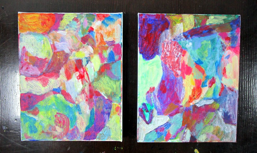 アトリエ・ブルートで、2枚の小さいキャンバスを用意していただき、アクリル画を描きました。